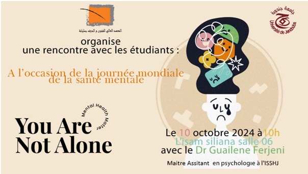 Le 10 octobre 2024, à l’occasion de la Journée mondiale de la santé mentale, l’ISAM Siliana a organisé une rencontre spéciale intitulée « You Are Not Alone », dédiée à la sensibilisation des étudiants aux enjeux de la santé mentale.