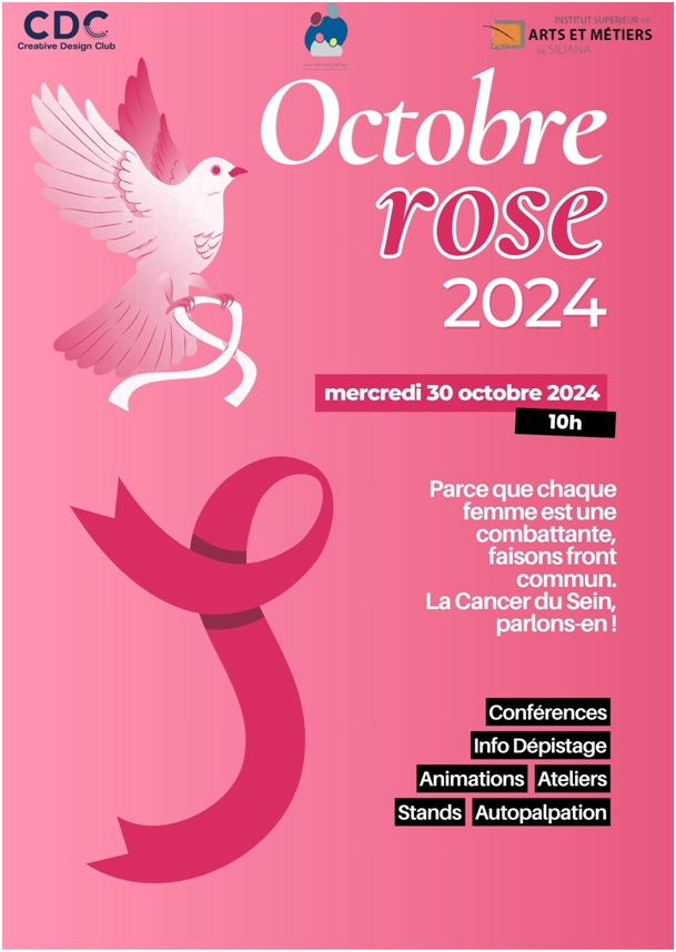 Le 30 octobre 2024, l’Institut Supérieur des Arts et Métiers de Siliana a organisé une journée de sensibilisation dédiée à la lutte contre le cancer du sein, dans le cadre de Octobre Rose 2024.