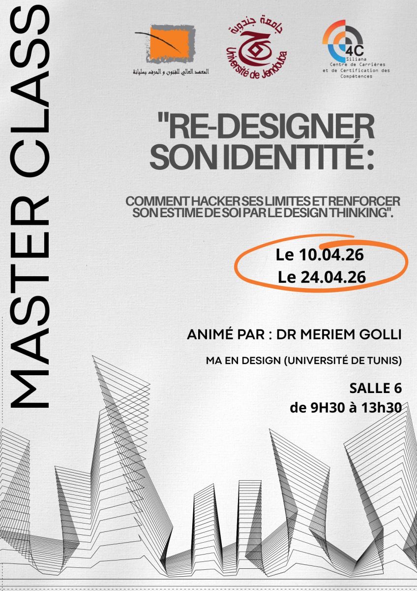 un workshop innovant destiné aux étudiants en Master, intitulé : "Re-designer son identité : comment hacker ses limites et renforcer son estime de soi par le design thinking". le 10 et le 24 avril 2026 public cible master 1